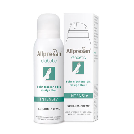 Die Allpresan® diabetic Schaum-Creme INTENSIV zur täglichen Behandlung und Pflege sehr trockener bis rissiger Fußhaut bei Diabetes mellitus fördert den Heilungsprozess der Fußhaut und unterstützt die Wiederherstellung der geschädigten Hautbarriere. Zudem wird der Juckreiz gelindert, die Druckstellen gemindert und der Verhornung entgegen gewirkt.