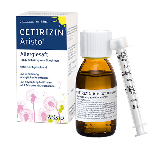 Cetirizin Aristo® Allergiesaft ist ein rezeptfreies Antiallergikum mit dem Wirkstoff Cetirizindihydrochlorid. Der Allergiesaft wird bei Kindern ab einem Alter von 2 Jahren und Erwachsenen zur Linderung von Nasen- und Augensymptomen bei saisonaler und ganzjähriger allergischen Erkrankungen wie allergischem Schnupfen (Rhinitis) und Nesselsucht (Urtikaria) eingesetzt. Das Besondere: als einziger Cetirizin Allergiesaft mit enthaltenen Dosierspritze wird eine höchst genaue und einfache Darreichung ermöglicht – auch bei den kleinen Patienten ohne Kleckern und Kleben.