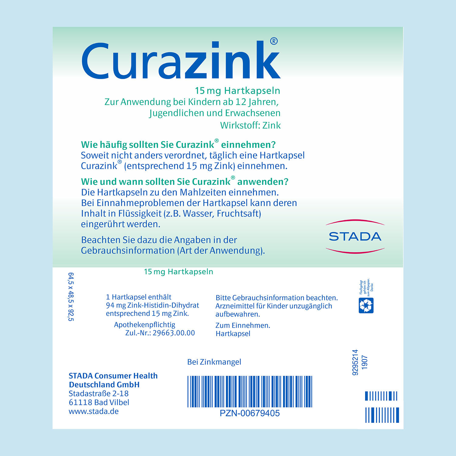 Täglich 1 Kapsel Curazink® (entsprechend 15 mg Zink) zu den Mahlzeiten einnehmen. Bei Einnahmeproblemen der Kapsel kann deren Inhalt in Flüssigkeit (z.B. Wasser, Fruchtsäfte) eingerührt werden.