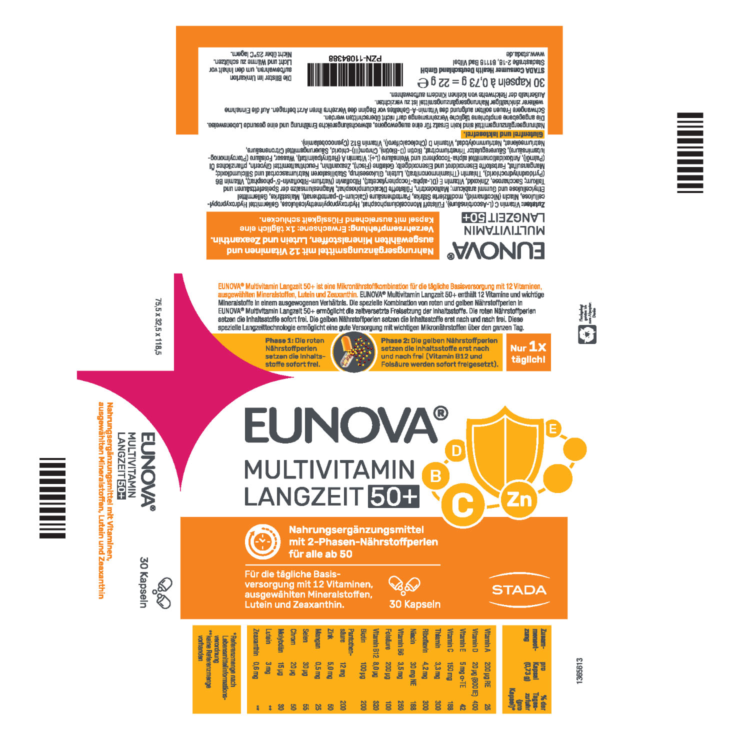 EUNOVA® Langzeit 50+ ist speziell auf den Nährstoffbedarf von Menschen ab 50 Jahren abgestimmt und enthält 12 Vitamine, wertvolle Mineralstoffe, Lutein und Zeaxanthin, die zu den Carotinoiden gehören, in einem ausgewogenen Verhältnis.