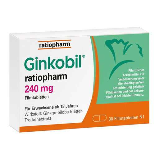 Wirkstoff: Ginkgo-biloba-Blätter-Trockenextrakt. Anwendungsgebiete: -40 mg; 80 mg; 120 mg; Tropfen: Zur symptomatischen Behandlung von hirnorganisch bedingten Leistungsstör. im Rahmen eines therapeutischen Gesamtkonzeptes bei Abnahme bzw. Verlust erworbener geistiger Fähigkeiten (dementielles Syndrom) mit den Hauptbeschwerden: Gedächtnisstörungen, Konzentrationsstörungen, depressive Verstimmung, Schwindel, Ohrensausen, Kopfschmerzen. Verlängerung der schmerzfreien Gehstrecke bei peripherer arterieller Verschlusskrankheit bei Stadium II nach FONTAINE („Schaufensterkrankheit“) im Rahmen physikalisch-therapeutischen Maßnahmen, insbesondere Gehtraining. Schwindel, Ohrgeräusche infolge Durchblutungsstörungen oder altersbedingten Rückbildungsvorgängen. -240 mg: Zur Verbesserung einer altersbedingten kognitiven Beeinträchtigung (Verschlechterung geistiger Fähigkeiten) und der Lebensqualität bei leichter Demenz. Warnhinw.: -Filmtbl.: AM enth. Lactose u. weniger als 1 mmol Natrium (23 mg) pro Filmtbl., d.h. es ist nahezu „natriumfrei“. -Tropfen: AM enth. weniger als 1 mmol (23 mg) Natrium pro 40 Tr., d.h., es ist nahezu „natriumfrei“.