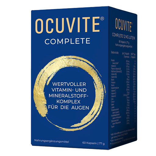 Unsere Augen müssen stetig mit Vitalstoffen versorgt werden, die sie stärken und schützen.2 Das Nahrungsergänzungsmittel Ocuvite® Complete  12 mg Lutein enthält die Vitamine A und B2 (Riboflavin) zum Erhalt der Seh- kraft sowie wertvolles Lutein, Omega-3-Fettsäuren und das wichtige Spurenelement Zink, dass dazu bei- trägt die Zellen vor oxidativem Stress zu schützen.