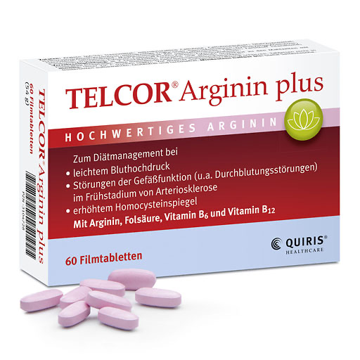 TELCOR® Arginin plus ist ein Lebensmittel für besondere medizinische Zwecke (bilanzierte Diät) und mit seiner besonderen Vitalstoffkombination aus natürlichem Arginin, Folsäure, Vitamin B6 und B12 zum Diätmanagement bei leichtem Bluthochdruck, gestörter Gefäßfunktion (u. a. Durchblutungsstörungen) im Frühstadium von Arteriosklerose und bei erhöhtem Homocysteinspiegel geeignet.